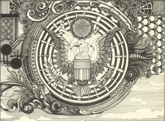 This detailed and modernized version of the eagle and shield from the dollar bill. Ink drawing on sketch paper. Has a clockwise look into a detailed design of history from the golden era to the modern era to an era of technology.